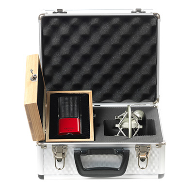 “Retro” Shockmount, wooden presentation box, metal road case and manual included.